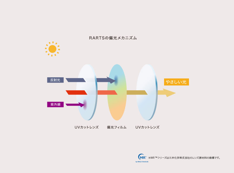 すべてにおいてプレミアムな素材から厳選 RARTSは耐熱性、耐衝撃性、染色性、加工性、偏光フィルムとの密着性に優れた光学材料である三井化学株式会社のMRTM材を使用し、従来の偏光レンズでは不可能とされていたナイロールフレームやツーポイントフレームにも対応が可能です。 |
